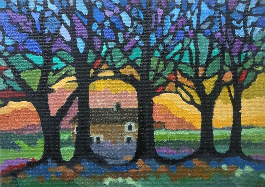 Categories Yorkshire Landscapes Stained glass trees #2 Post author By admin Post date October 5, 2016 No Comments on Stained glass trees #2 Stained glass trees #2, 2014, oil on cork tile, (SOLD) Trees and cottage in the morning light.